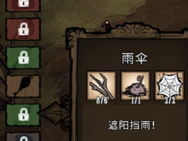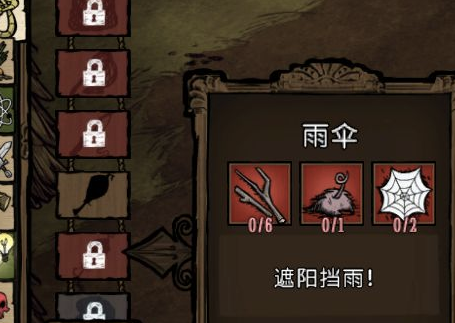 2、先看制作雨伞所需要的材料是:6个树枝,1个猪皮,2个蜘蛛丝。