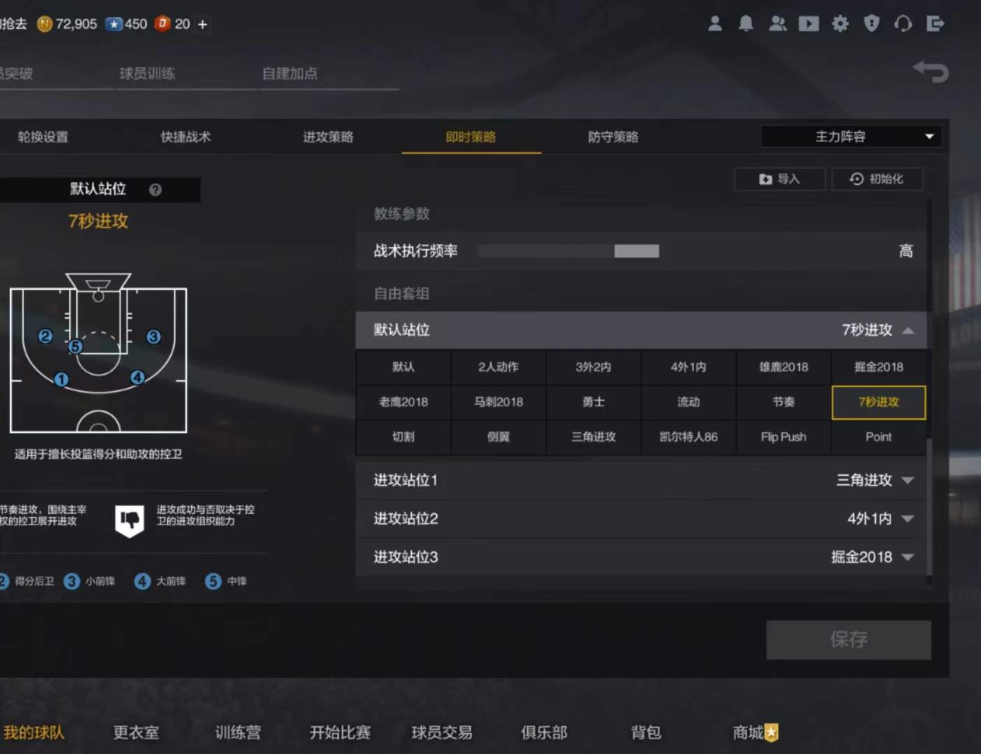 2、进入我的球队界面后,在上方导航栏中选择【即时策略】,可以看见在【自由套组】里可以调整【进攻站位】,点击进攻站位可以看见下拉的四外以内、三外两内、五外等战术,点击五外即可设置完成。在游戏中点击小键盘的4就可以设置五外。
