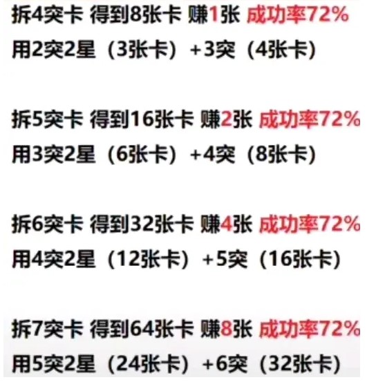 赌卡可以使用自己垫自己,假设我们拆7,然后合出一张6突和一张5.2突的卡,先不要直接莽6 5.2,剩下的8张单卡用2 1的方式垫,来试探系统的节奏,如果单卡能赚到大于2张,可以选择收一波手重新拆,下面来看它们的概率。