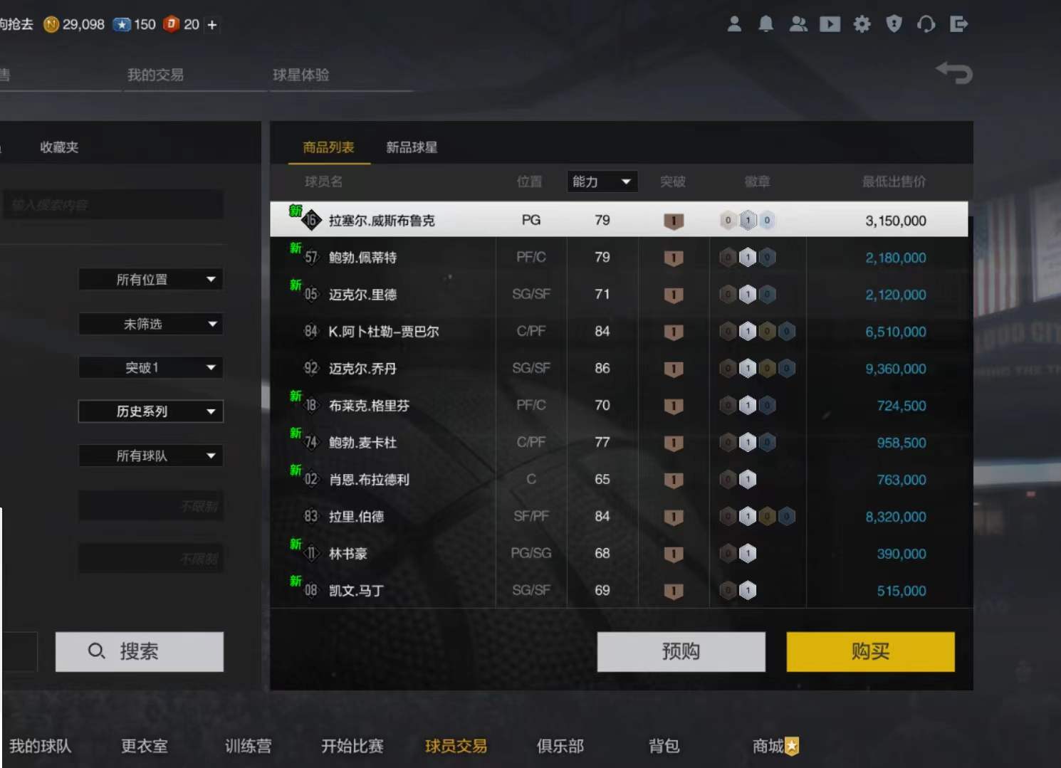 NBA2KOL2s13历史球员有拉塞尔威斯布鲁克、迈克尔里德、布莱克格里芬、林书豪等下面五副图片中球员名字坐上角带有绿色【新】字的球员,s13球员刚刚更新,价格有所上涨,建议玩家隔一段时间再入手。