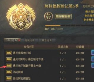 2、探险记任务。通关任意地下城后,翻1次黄金卡牌,即可完成“通关地下城翻开黄金卡牌”任务。小手一抖,经验到手。