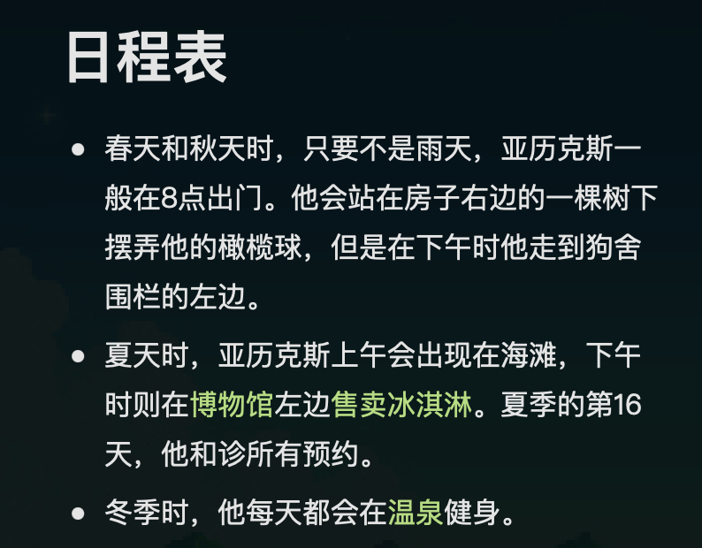 1、亚历克斯(Alex)是星露谷物语中鹈鹕镇的一位村民。他是可攻略结婚的12个角色之一。他住在皮埃尔的杂货店东南处的一所房子里(河路1号)。