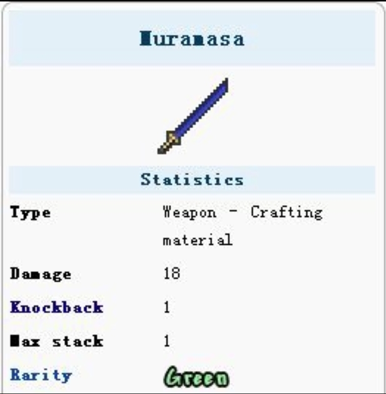 泰拉瑞亚中鬼妖村正的ID为155,鬼妖村正它本身就是一种重要的合成材料,可以用来合成永夜之刃,而它比较稀有,只能在地牢的金箱中找到。