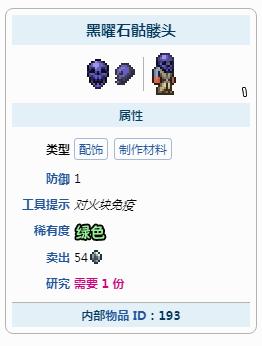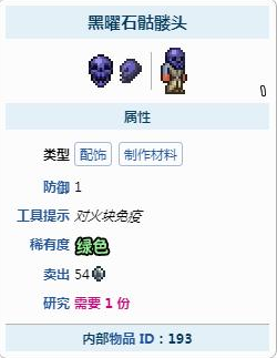 游戏中黑曜石骷髅头是一种配饰,能够免疫通常由与陨石和狱石接触而造成的燃烧伤害,但不会对熔岩或其他火焰的攻击给予免疫。