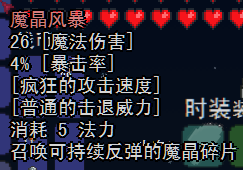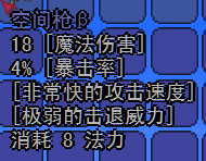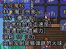 向鼠标所在方向射出一大堆魔晶,魔晶不受重力影响,伤害与魔晶移动速度无关,附带极弱的光亮效果,在飞行三秒后便会消失,可以弹射,撞到物块后会自动反弹。