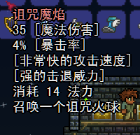 向鼠标所在方向射出一团受重力影响的魔焰,可以弹射4次,可以对俩个目标造成伤害,并且对所攻击到的目标造成诅咒地狱的debuff,诅咒魔焰也能在水下飞行。