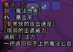在笔直飞行16个方块后开始受重力影响下坠,如果是垂直向下扔则不受影响。无法自动连续攻击,每一把魔法飞刀最多可以穿透俩个目标。碰到物块后消失。