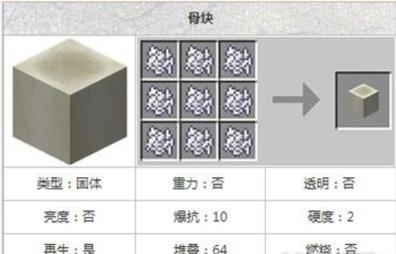 b,它可以被任何镐开采,如果不用镐破坏,将不会掉落物品。金镐对它的破坏速度最快,为0.25秒/个。 骨块可以由9个骨粉合成,主要起到压缩和储存骨粉的作用。骨块会作为能在沙漠和沼泽生物群系找到的化石结构的一部分自然生成。