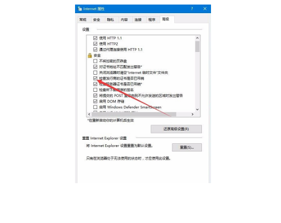 2.在internet选项 界面点击上方【高级】选项,在高级下方框中,找到【检查发行商证书是否吊销】将其取消勾选,然后点击确定进行保存即可
