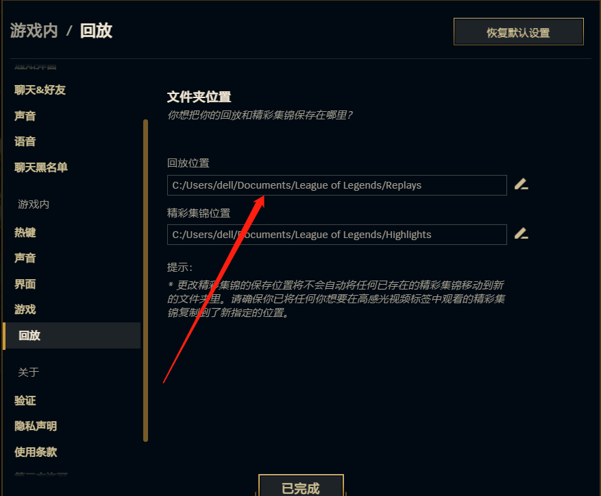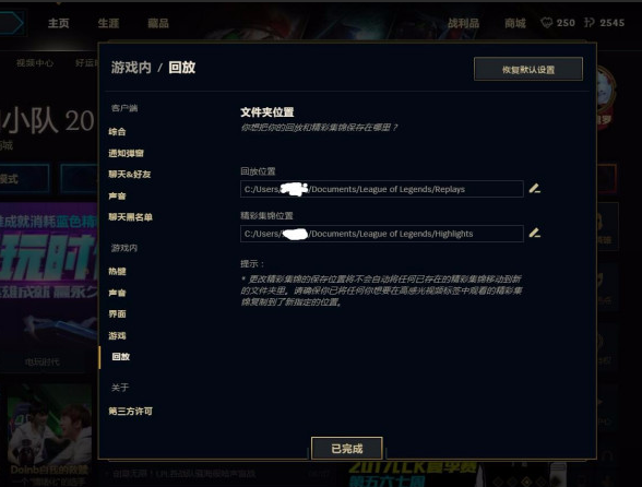 1.对局回放的录像文件是默认存放在您的电脑C盘的 用户“您的用户名”我的文档League of LegendsReplays目录下。