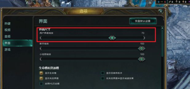 2、将“用户界面缩放”划钮滑动到想要的数值(按钮滑动的时候游戏界面会做出相应的变化,选出想要的数据)