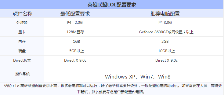 英雄联盟作为一款大型网游,是近几年来最火爆的游戏之一了。很多玩家想要入坑,又担心自己的电脑能不能运行英雄联盟,那么关于英雄联盟的最低配置要求以及推荐配置,可以参考下图: