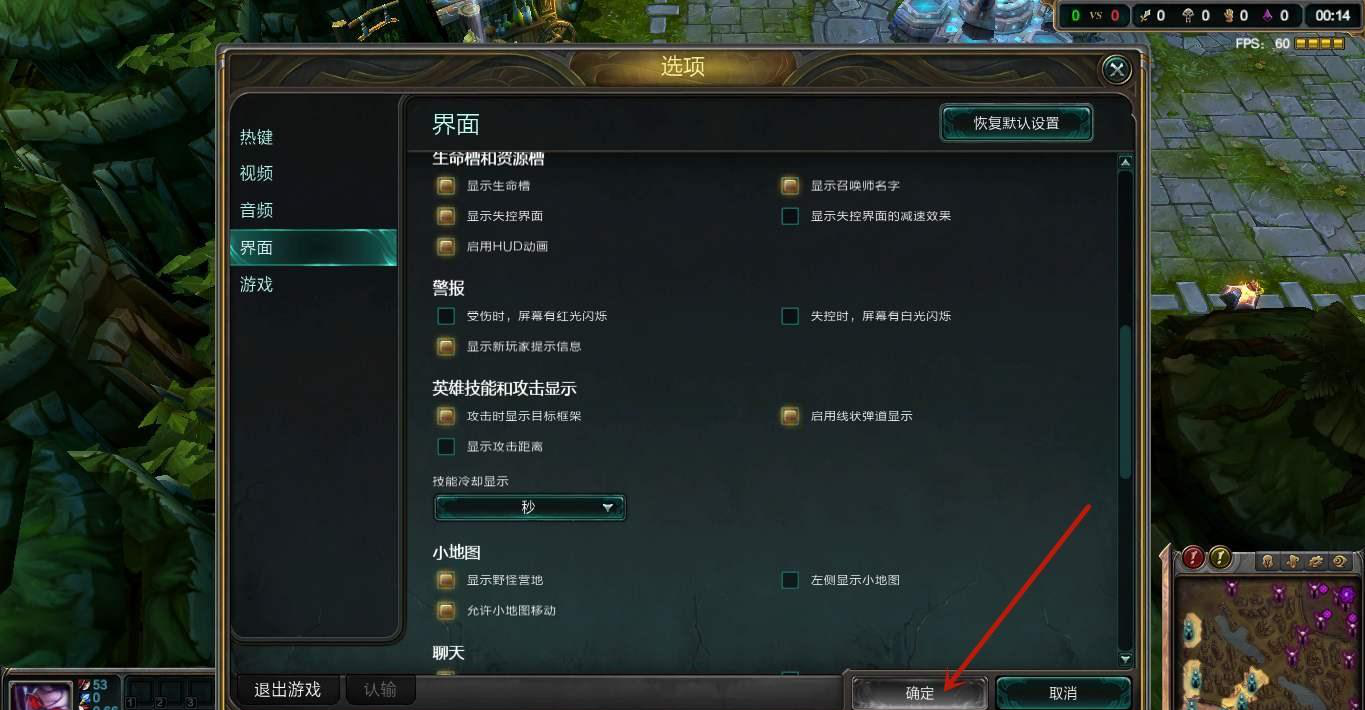 ②选择“界面”。在“英雄技能和攻击显示”下,勾选“显示攻击距离”