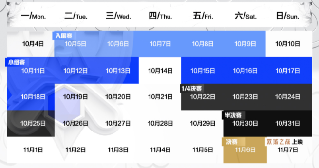 4、10月22日四强赛、10月30日半决赛、11月6日决赛。