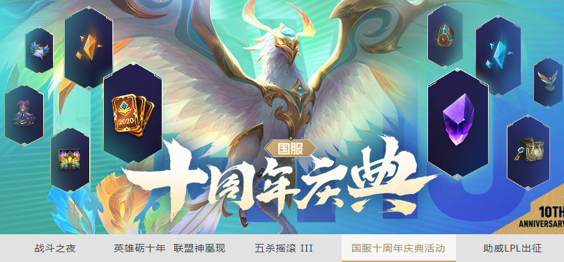从9月3日-10月17日期间,玩家只需每天登陆游戏,完成1场任意模式对局(不包含自定义与训练模式,逃跑和重开局不会计入任务进度)就能解锁1个任务奖励,一共10个,最终极的奖励是这次10周年的限定皮肤神凤行者冰鸟皮肤。需要注意的是,这次的活动界面在游戏客户端内,进游戏就能看到了。