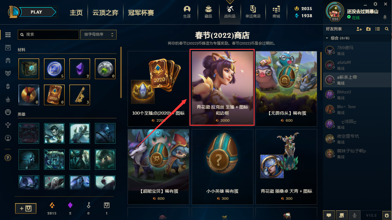 1、由下图可知,本次春节活动的至臻皮肤是拉克丝的青花瓷。