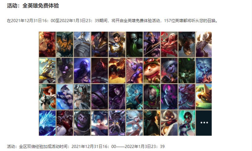 2、在2021年12月31日16:00至2022年1月3日23:39期间,将开启全英雄免费体验活动。