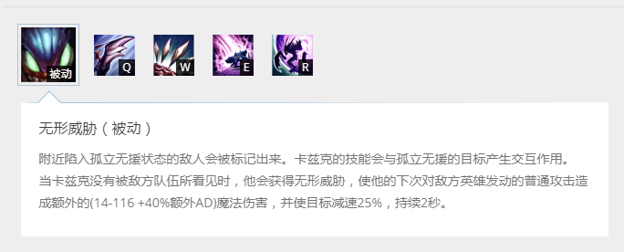 在卡兹克没有被敌方队伍(敌方英雄和敌方小兵)所看见时,他会触发孤立无援,使他的下次对敌方英雄发动的普通攻击造成额外的(14-116 40%额外的AD)魔法伤害,并使目标25%,持续两秒。