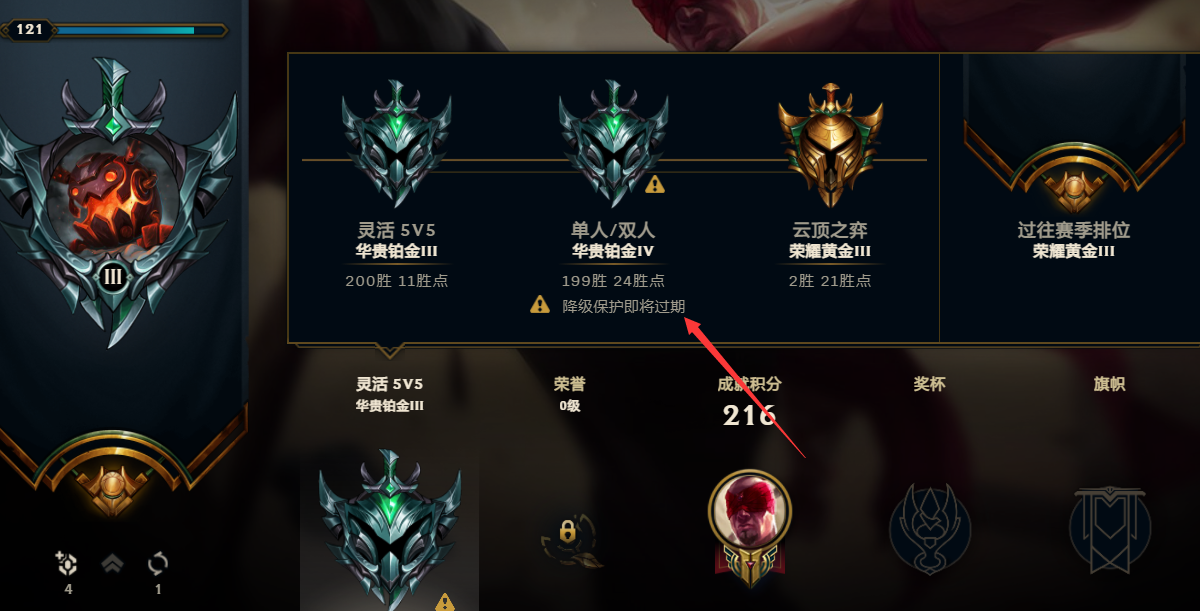 《LOL》中每个大段位都是有段位保护的,一般都是段位保护都是五局,如果铂金4胜点为0之后连输5局之后就会出现一个黄色感叹号,那就是代表段位保护已过期,再输就会掉段了。