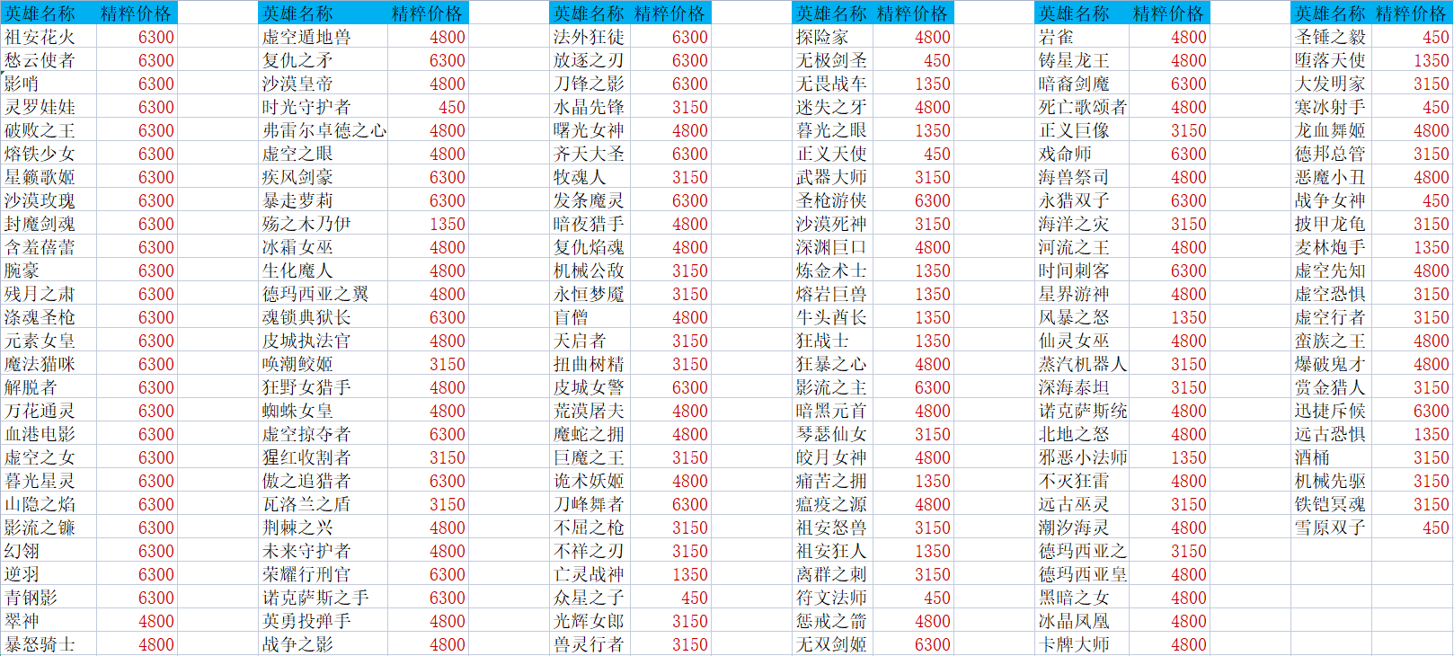 lol英雄精粹价格大全是什么? 2023-08-09 12:36:11 《英雄联盟》端游截至2022年2月7日,共有157位英雄,除了几位免费赠送的英雄外,其他要用点券或精粹购买,下面是整理的英雄精粹价格。