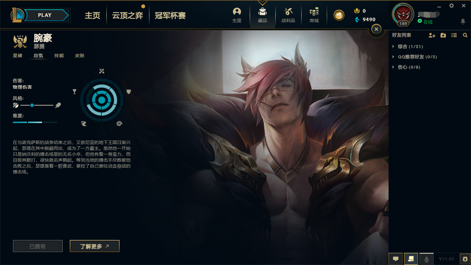 英雄联盟中瑟提是第148位英雄,全名腕豪-瑟提。