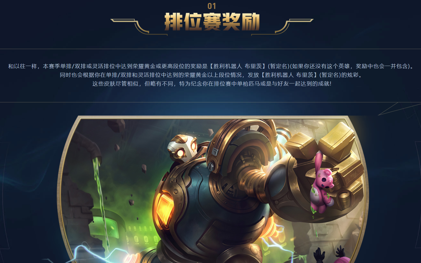 1.S11赛季奖励皮肤是【胜利机器人-布里茨】,在排位中段位达到黄金及以上会获得,如果段位在黄金之上,会额外获得炫彩皮肤奖励!
