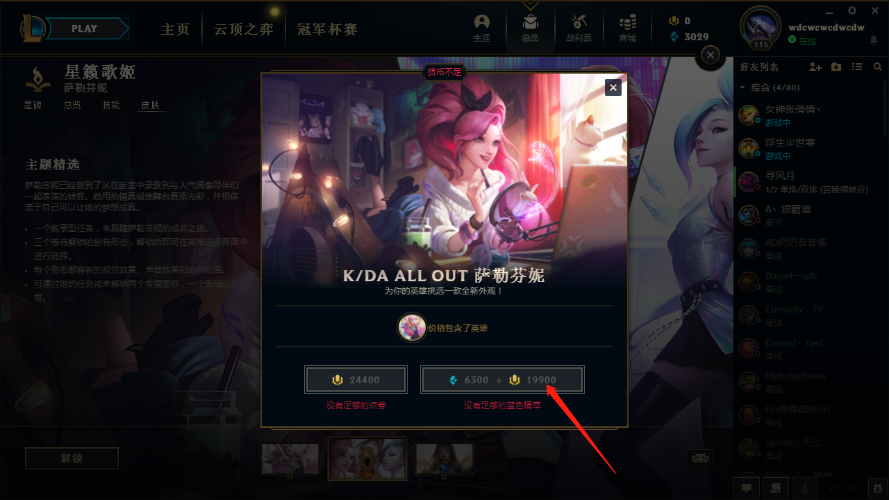 二.点击解锁之后我们可以看到萨勒芬妮KDA这款皮肤的价格了,价格是19900点券,人民币199块钱。