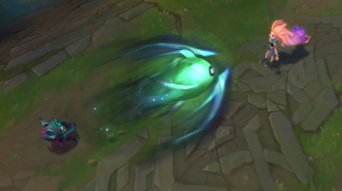 薇古丝向前放出一团波云,沿途对敌人造成魔法伤害。经过短暂延迟后,波云加快速度但缩减宽度。寒心波云可以引爆敌人身上的暮气标记。