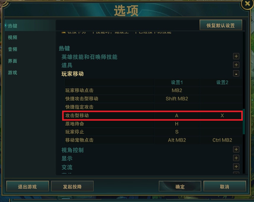2.在热键中,选择玩家移动,点击攻击型移动,默认按键是A键;