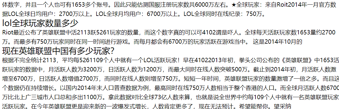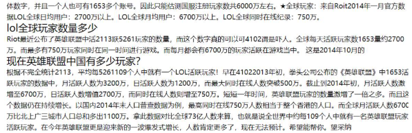2.英雄联盟国服注册人数在6000万左右,其他的服务器不确定,日活跃量高达750万人,这是一个惊人的数字