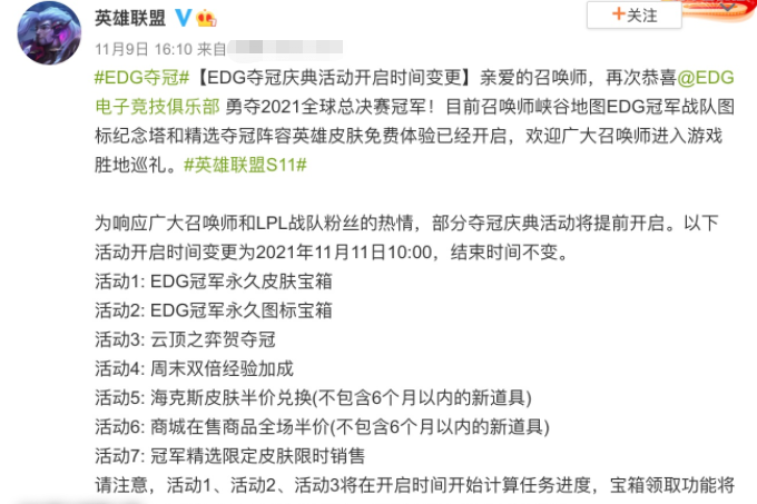 1、S11夺冠庆典活动已经开始了,英雄联盟官方于11月9日下午在官博发文,宣布为响应广大召唤师和LPL战队粉丝的热情,将提前开启部分夺冠庆典活动。
