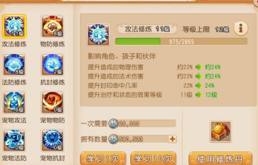 4、修炼:修炼优先点攻修,毕竟关系到奶量以及助战的输出量。其次是法防、物防,最后点抗封(可以先将攻修防修点到8,再将攻修点满,回过头来再点防修)。
