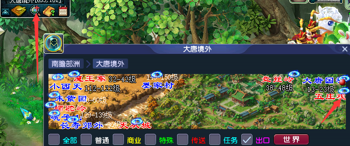 从长安城点左上角的放大镜图标的地图移动到大唐国境,再移动到大唐境外,再次点击地图选择五庄观的传送阵自动寻路就可以到达五庄观了。