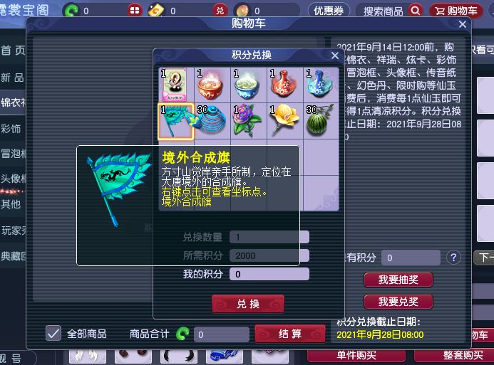 2.用暑假清凉积分换,玩家在暑假期间消费仙玉都可以获得暑假清凉积分,每点仙玉对应的一点暑假清凉积分,消费2000点仙玉就可以兑换一个境外合成旗,而且兑换的时候还没有数量限制,只要玩家的积分足够,想兑换多少都是可以的。