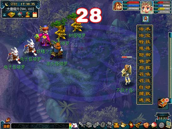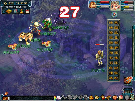 你继续在大唐境外寻找妖怪,途中听到少女(大唐境外559,104)在哭泣,你好意送她回家,谁知这姑娘说肚子饿了,竟是要将你做点心吃了!毫无疑问,这姑娘定是妖怪变的。一番大战,妖怪自是不敌,化作一阵青烟便逃走了。(需战斗)