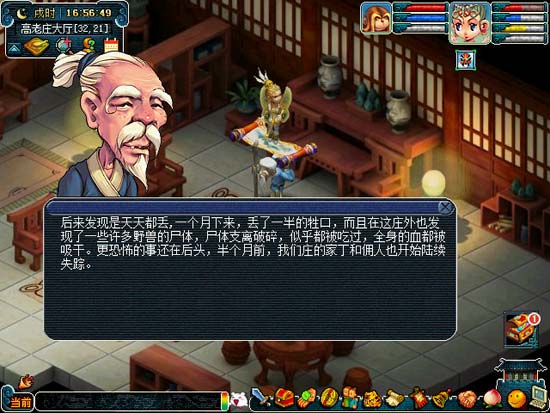你从云游僧(大唐境外350,30)那儿得知高老庄如今的状况。连忙进庄找高老先生(高老庄大厅32,21)了解情况,得知情况危急,恐有邪魔妖孽作祟,于是在大唐境外巡游打探。