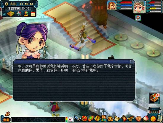 这妖怪逃跑功夫一流,需要想办法破解才行。你又来找李靖(凌霄宝殿30,36)询问,这次李天王让你去找太上老君(兜率宫11,16)想办法。你帮太上老君找来定神香与白露为霜,老君却告诉你用来降妖的宝物让人借走了,不过可以引荐你去找哪吒借混天绫。你找哪吒(凌霄宝殿66,33)说明来意,他痛快的将混天绫借给了你。