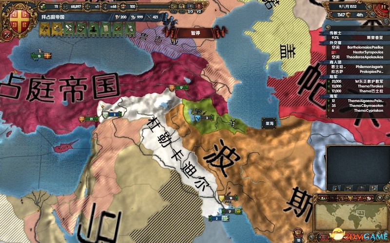 用的拜占庭,北方的匈牙利被打成联统,杜勒卡迪尔也是附庸国,这个T字刚好把小马和波斯隔开。黑羊刚被打成两个城。撤掉所以宣称。下场可以吞并。然后给杜勒卡迪尔吃。