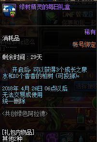 17级以上的玩家可以在推荐的地下城中获得成长之泉水。绿树精灵的每日礼盒开启后可以获得3个成长之泉水和20个香香的柏树。